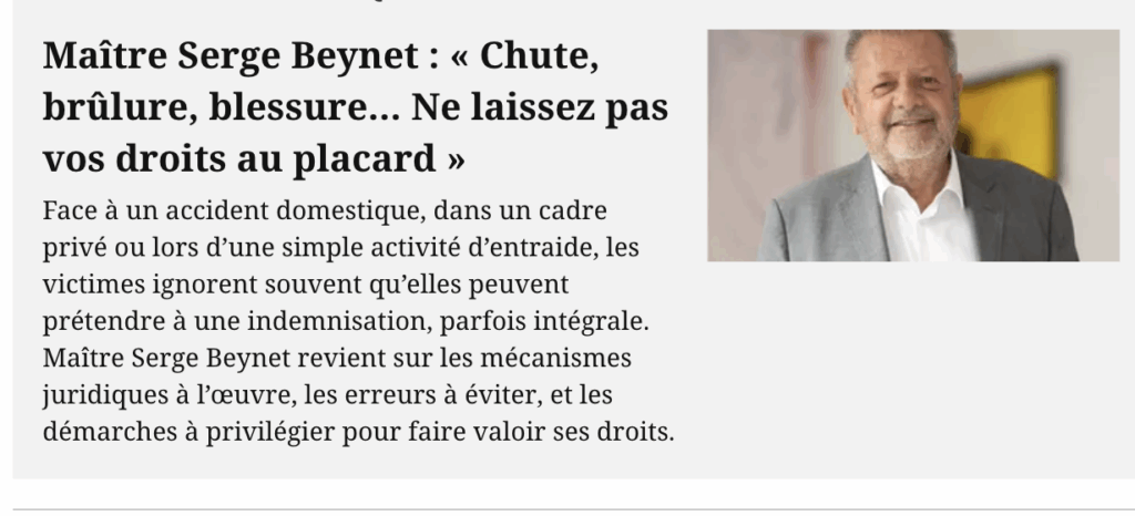 Face à un accident domestique, dans un cadre privé ou lors d’une simple activité d’entraide, les victimes ignorent souvent qu’elles peuvent prétendre à une indemnisation, parfois intégrale. Maître Serge Beynet revient sur les mécanismes juridiques à l’œuvre, les erreurs à éviter, et les démarches à privilégier pour faire valoir ses droits.
